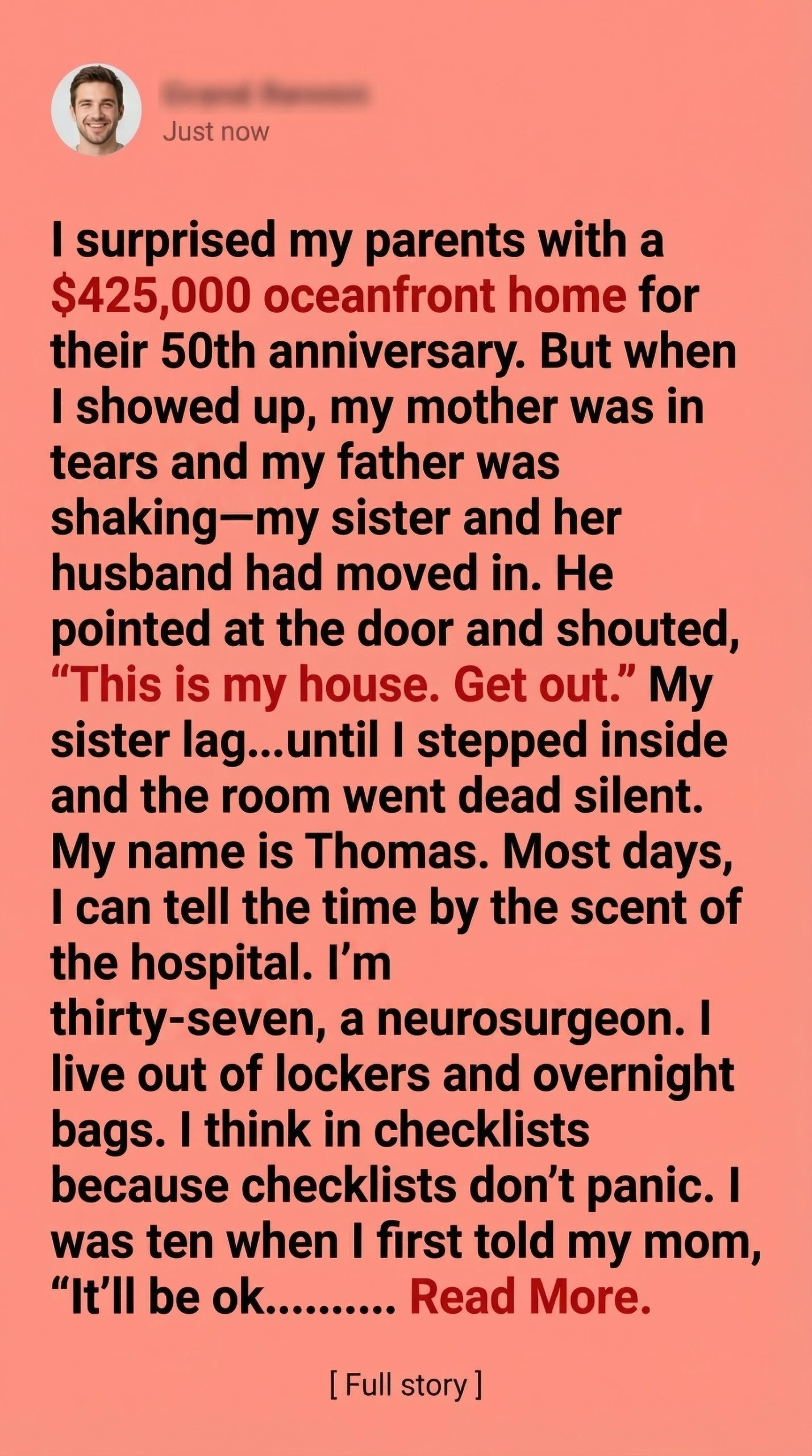 “I signed the deed over to them, Thomas,” my father whispered. “They said… they said they’d take care of us. They said you were too busy at the hospital to actually be here.”