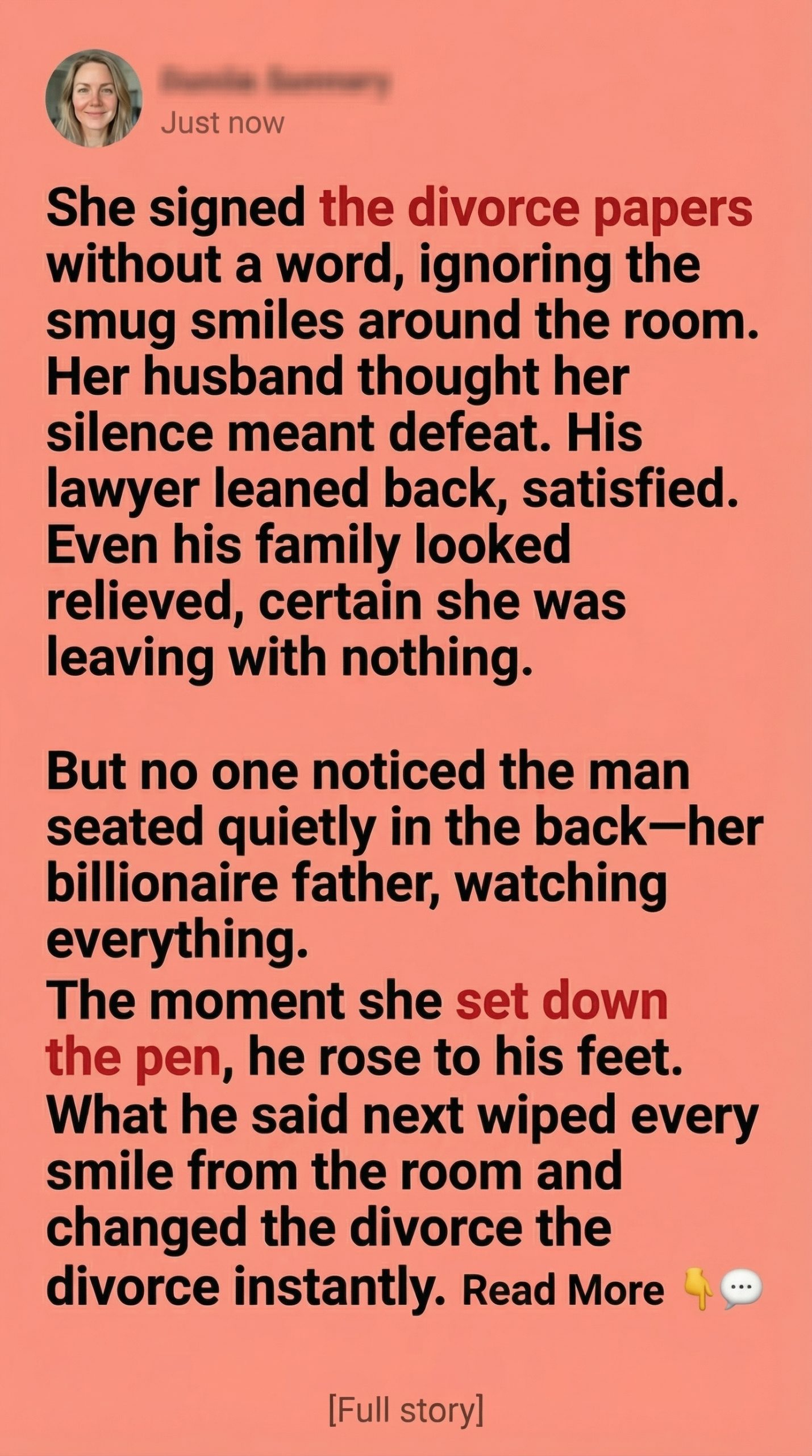 She sat at the long table, hands steady, eyes unreadable. Across from her, her husband leaned back in his chair, one arm draped casually over the leather, a faint smirk playing at his lips. His lawyer shuffled papers with quiet confidence, already certain of the outcome.